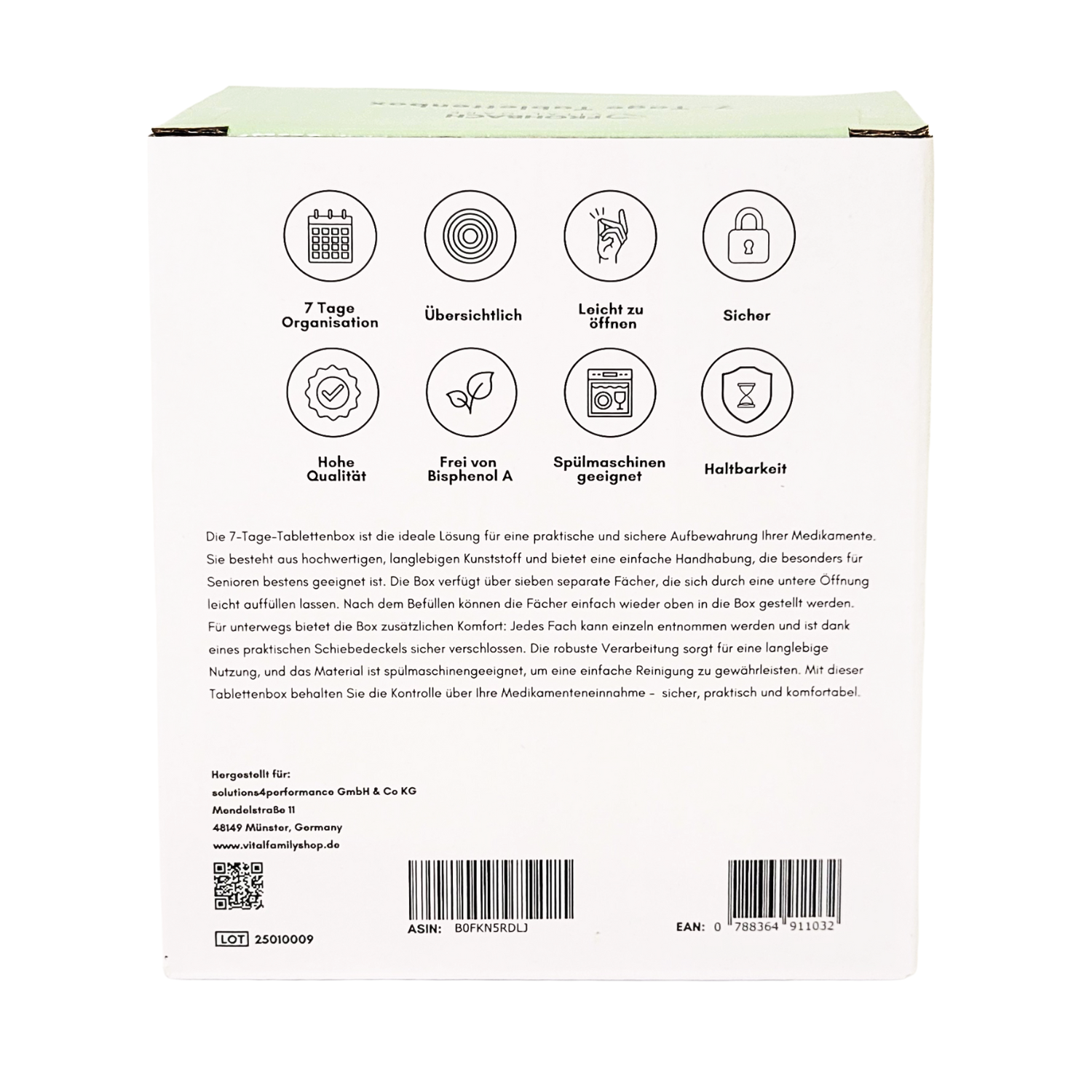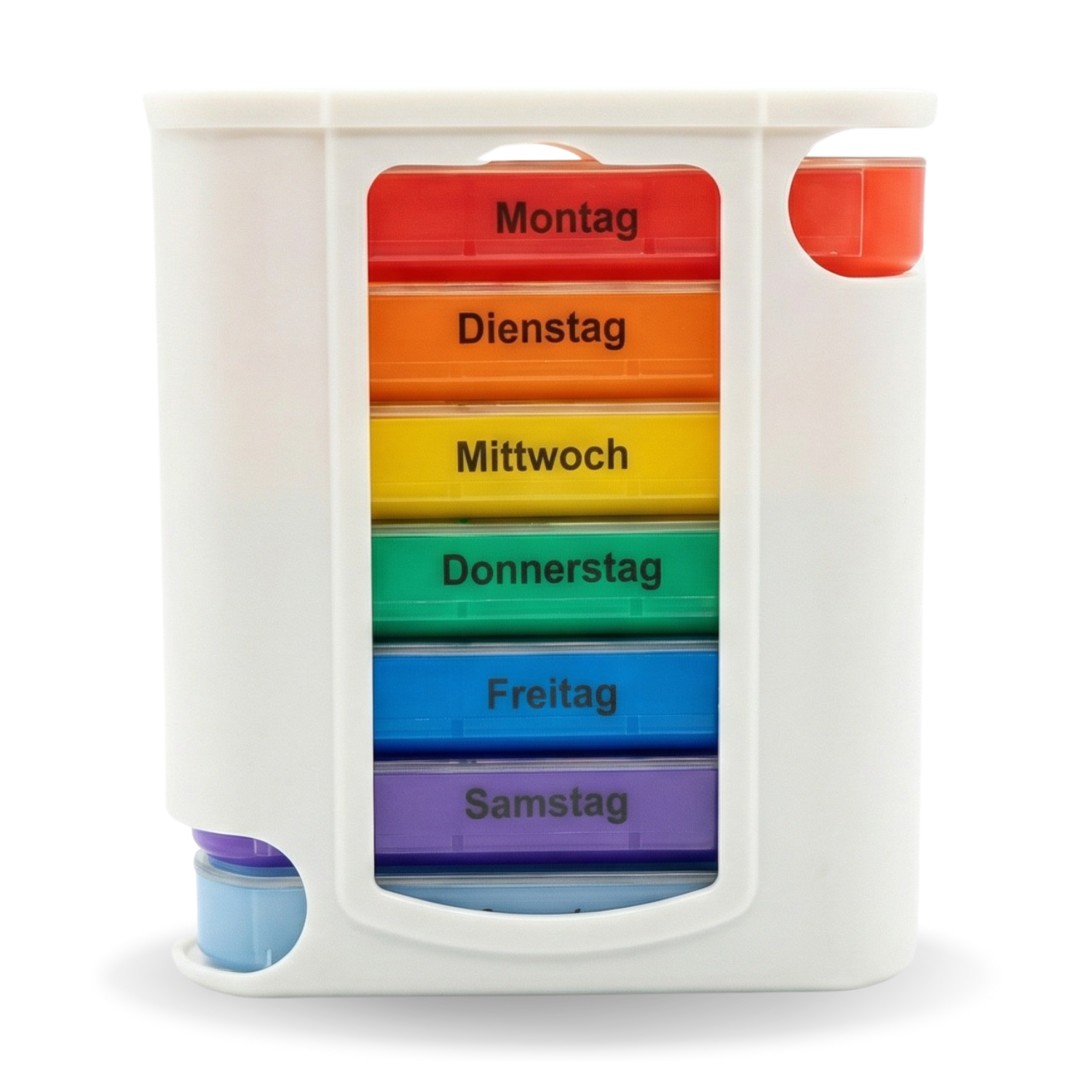Mit der Frohbach 7-Tage-Tablettenbox lassen sich Medikamente übersichtlich und geordnet aufbewahren. Sie besteht aus sieben einzelnen Tagesboxen, die jeweils vier Fächer für unterschiedliche Einnahmezeiten bieten. Die Tagesboxen sind spülmaschinenfest und können bequem von oben oder unten aus der Hauptbox entnommen werden. Transparente Schiebedeckel ermöglichen eine einfache Kontrolle und Entnahme der täglichen Portionen.