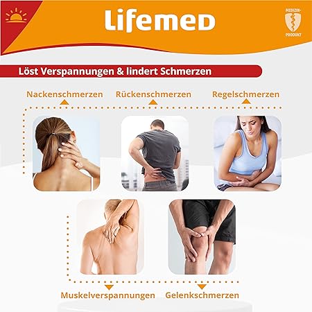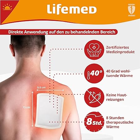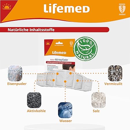 Das selbsterwärmende Lifemed®-Nacken-Wärmepflaster besteht aus weichem, hautfreundlichem Gewebe und spendet einmalig bis zu 8 Stunden Wärme. Es wurde speziell für die örtliche Wärmetherapie bei akuten Nackenschmerzen entwickelt. Es lindert mit seiner angenehmen Wärme wirksam Schmerzen und entspannt die verkrampfte Muskulatur. Nach dem Öffnen erwärmt sich das Pflaster bei Kontakt mit Sauerstoff innerhalb weniger Sekunden von selbst.